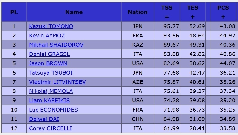 哈萨克斯坦名将沙多罗夫尽管有勾手四周接三周、阿克塞尔三周以及后半段外点四周,基础分全场最高,但他的跳跃周数和落冰总有小瑕疵,最终以89.67(技术49.31/节目内容40.36)排在第三。