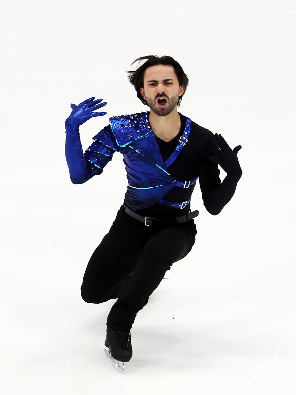 法国名将阿莫兹以两首流行歌曲为伴奏,后外点冰四周接三周节奏感强;大一字衔接外勾手难度进入阿克塞尔三周执行分也不错;但换足燕式旋转因为速度不够被扣分,勾手跳只能做三周。换足蹲踞后音乐变奏,接续步编入很多花样衔接动作,表现力极为了得;技术48.64/节目内容44.92,以93.56排在第二。
