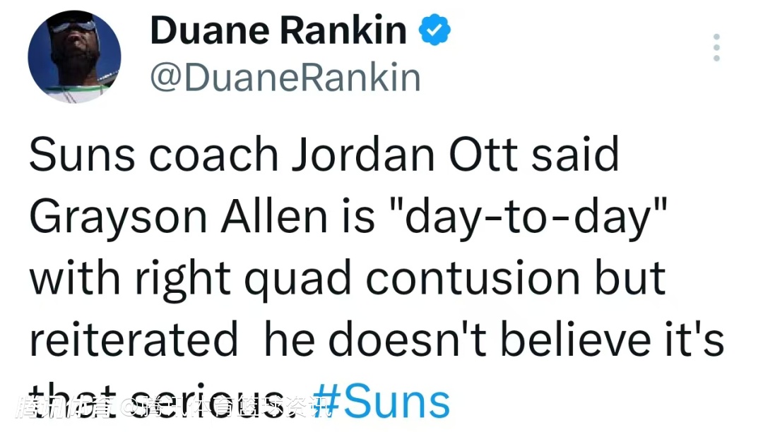 太阳主帅:阿伦因右大腿挫伤仍处于每日观察状态 看起来不算太严重