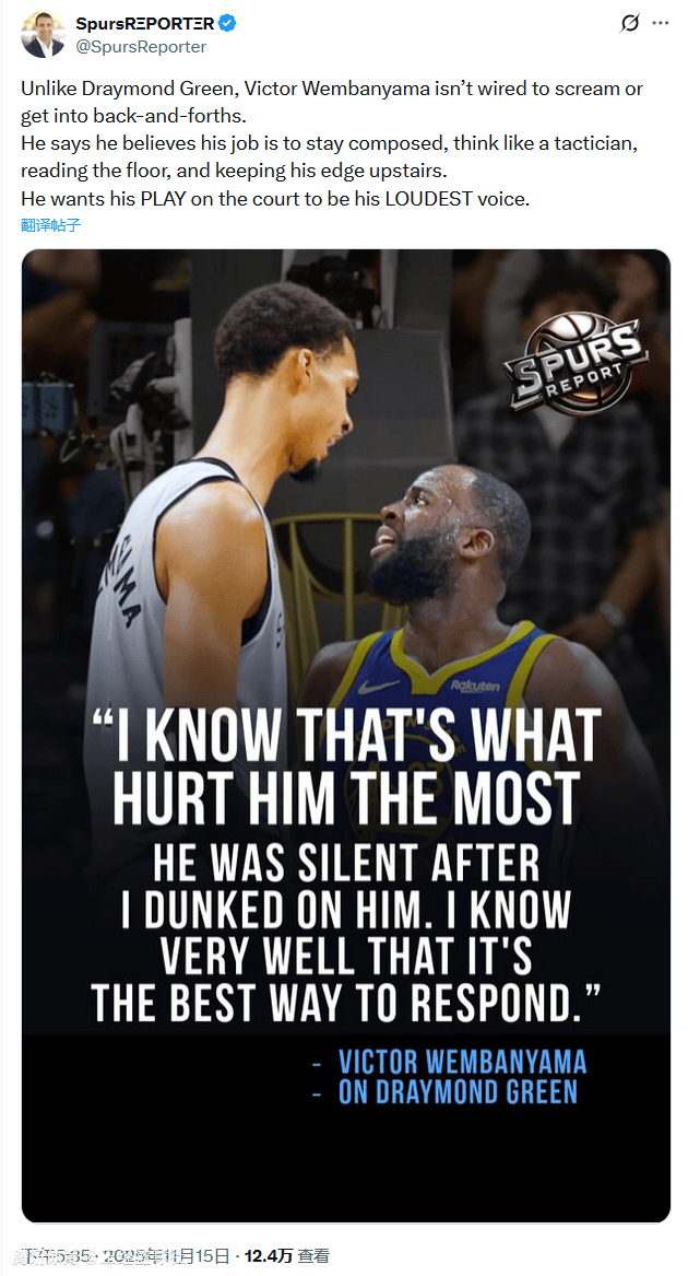 2025-11-16 07:10北京时间11月16日,NBA常规赛继续进行。马刺队和勇士队过去三天交手两次,文班亚马面对追梦格林的防守打得并不是很出色,两人在比赛中多次发生冲突,文班亚马对此进行了回应。