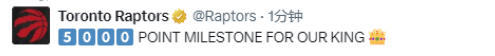 在巴恩斯达成里程碑后,猛龙队在官方社交媒体上发图庆祝,并配文写道:“我们的国王达成5000分里程碑。”