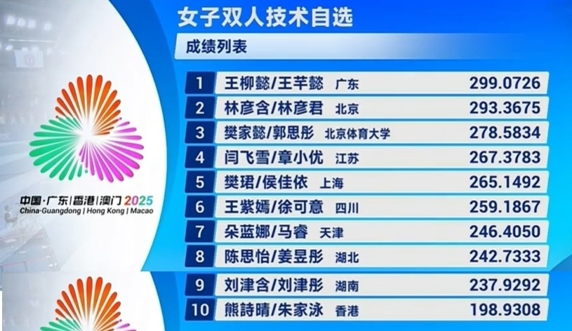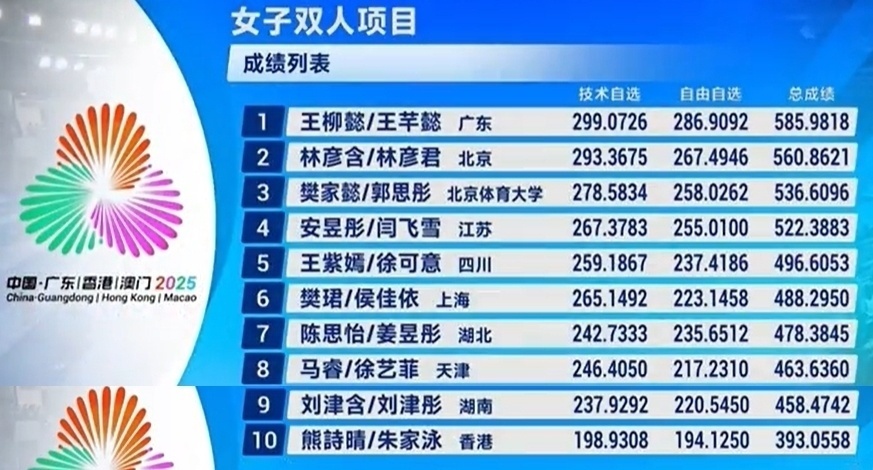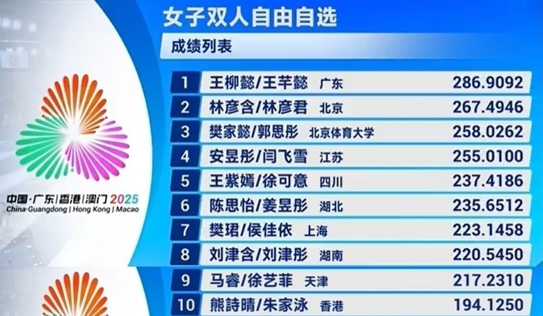 全运花游双人:东道主王柳懿/王芊懿技压群芳!北京林氏姐妹摘银