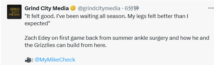 2025-11-16 10:20北京时间11月16日,NBA常规赛继续进行,灰熊队100-108不敌骑士队。扎克-伊迪此役复出,他首发出战25分钟,6投3中得到13分7篮板2抢断2盖帽。赛后,伊迪接受媒体采访。