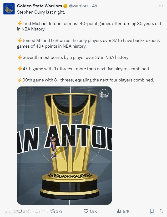 勇士官方晒库里95分!创13纪录被赞GOAT 科尔直言不断带来惊喜