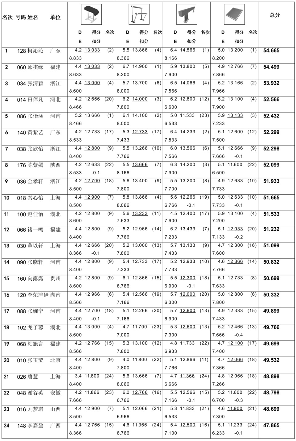 以下是全能决赛24位选手的小分情况: