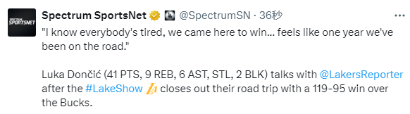 2025-11-16 12:10北京时间11月16日,NBA常规赛继续进行,湖人以119-95战胜雄鹿。本场比赛,湖人球星东契奇出战38分钟,全场19投9中,其中三分球11投5中,罚球20投18中,得到41分9篮板6助攻1抢断2封盖。赛后,他接受媒体采访。