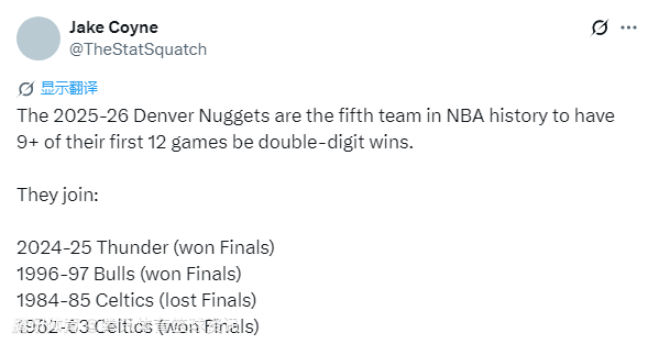 根据数据统计显示,本赛季的掘金队,成为NBA历史上第五支在赛季前12场比赛中拿下9场及以上两位数胜分胜利的球队。