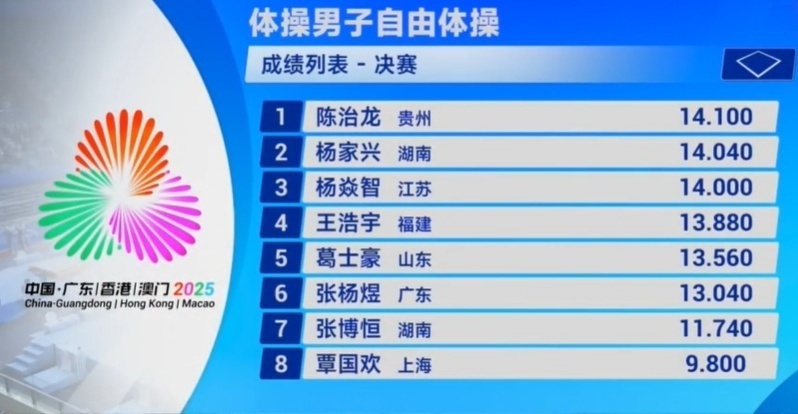 2025-11-16 20:50第十五届全运会竞技体操单项决赛揭开战幕:在男子自由操决赛里,贵州选手陈治龙以14.10收获金牌;银牌归属湖南选手杨家兴,成绩是14.04;江苏选手杨焱智以14.00分摘铜。