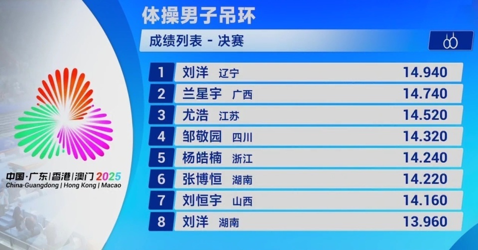 2025-11-16 22:50第十五届全运会竞技体操单项决赛揭开战幕:在男子吊环决赛里,辽宁老将刘洋以14.94分卫冕;广西名将兰星宇以0.2分之差摘银,铜牌归属江苏老将尤浩,成绩及时14.52—复制了上届全运会的领奖台。张博恒以14.22分排名第六。