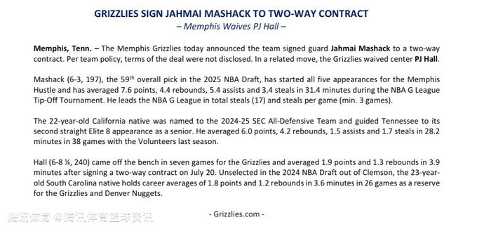 2025-11-17 06:30北京时间11月17日,灰熊队官方宣布,已与贾迈-马沙克签下双向合同。作为相关操作,二年级内线球员PJ-霍尔被球队裁掉。