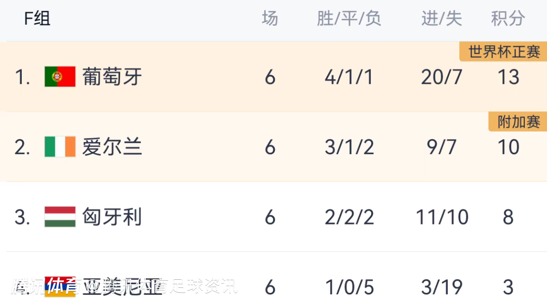 F组最终形势:葡萄牙以头名出线,爱尔兰获得附加赛资格,匈牙利、亚美尼亚双双出局。