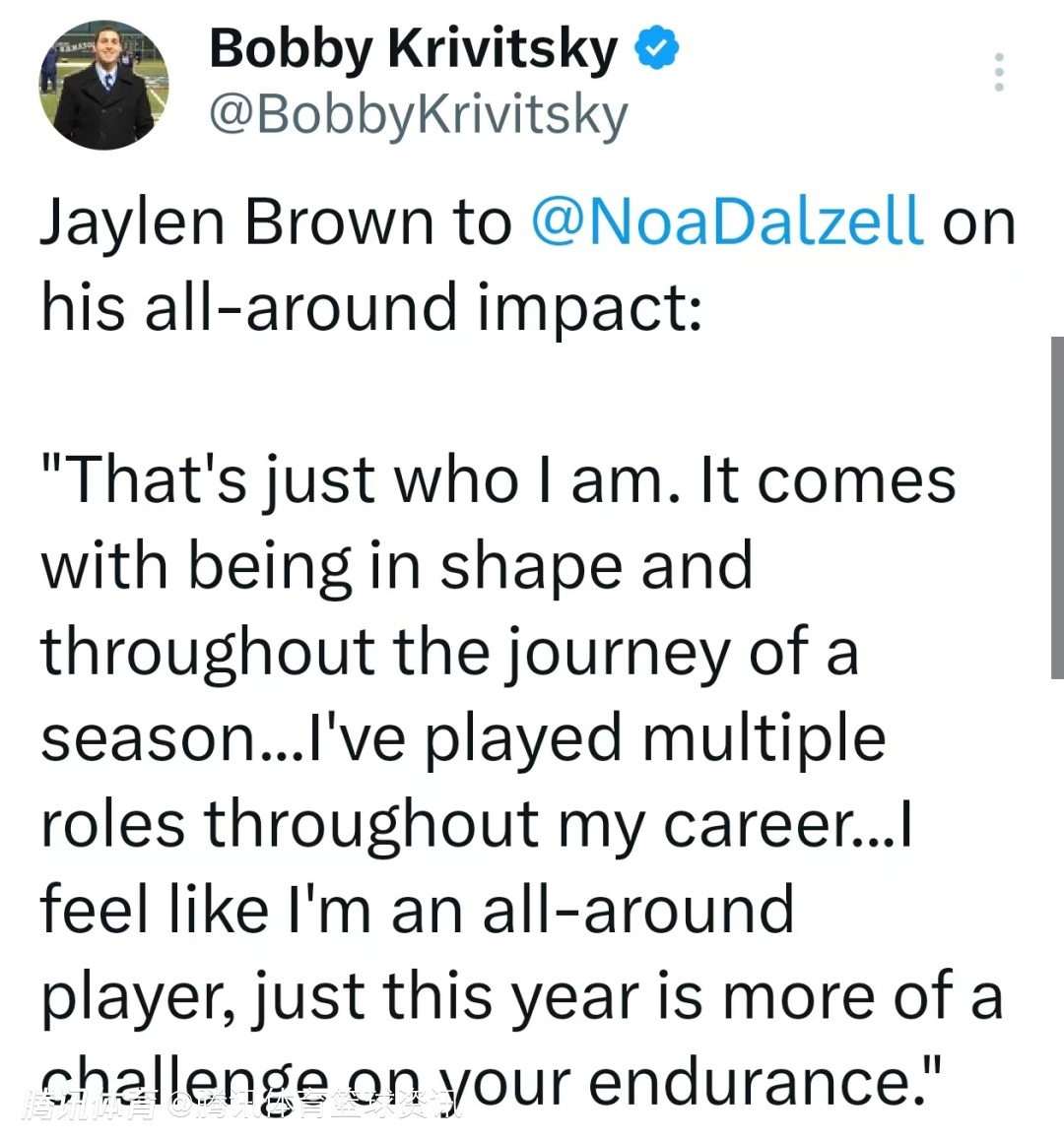在谈及自己的全面影响力时,杰伦-布朗说道:“这就是我的本色。这离不开良好的体能状态,也源于整个赛季的征程,我的职业生涯中曾扮演过多种角色,我认为自己是一名全能型球员,只是今年在耐力方面面临着更大的挑战。”