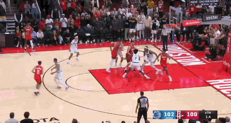 第四节比赛结束前5.3秒,两队打成100平,火箭队让申京发边线球,但杜兰特接球后脚滑摔倒,布莱克快攻,申京追防犯规,但布莱克依然完成扣篮。但之后布莱克罚球不中,火箭队再次暂停。