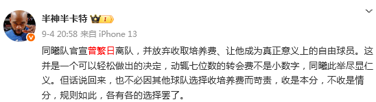 媒体人“半神半卡特”发文点评:这并不是一个可以轻松做出的决定,动辄七位数的转会费不是小数字,同曦此举尽显仁义。但话说回来,也不必因其他球队选择收培养费而苛责,收是本分,不收是情分,规则如此,各有各的选择罢了。