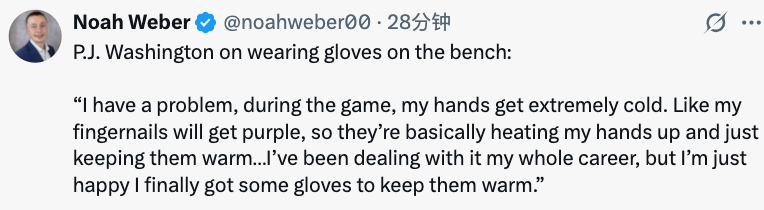 华盛顿先是谈到自己在替补席戴手套的原因,他表示:“我有个困扰,比赛的时候我的手会变得特别冷,连指甲都会发紫。所以手套主要是用来给手升温、保暖的。整个职业生涯我都在应对这个问题,还好终于有了能保暖的手套,挺开心的。”