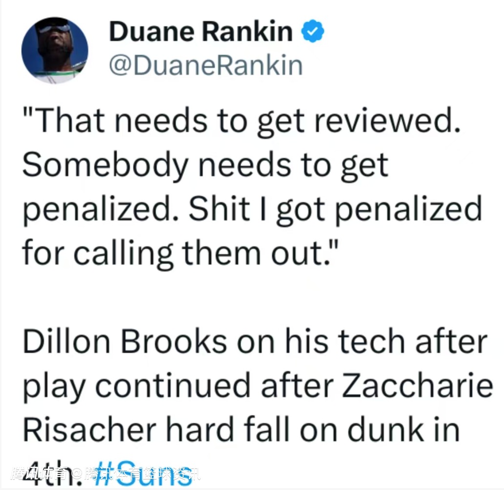 本场比赛第四节,老鹰球员里萨谢扣篮后重重摔倒,比赛仍在继续,随后狄龙-布鲁克斯因抱怨被吹罚技术犯规。狄龙直接点名了给自已吹罚技术犯规的裁判贾斯汀-范杜因,“情绪化的裁判做出了情绪化的判罚,”布鲁克斯赛后对记者表示,并称太阳队当时像是在“5打7”。