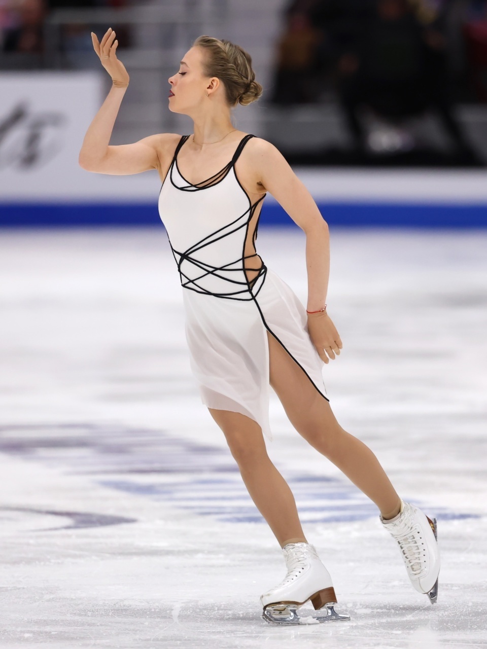 古巴诺娃以《人鬼情未了》原声为伴奏,她的滑行以及动作风格俄系风明显:开场包含内点三周接三周在内的四组跳跃都很稳健;跳进燕式转调整后,又完成剩下三组跳跃以及步伐和旋转,技术69.58/节目内容67.04,合计13662,总分204.69收获铜牌。