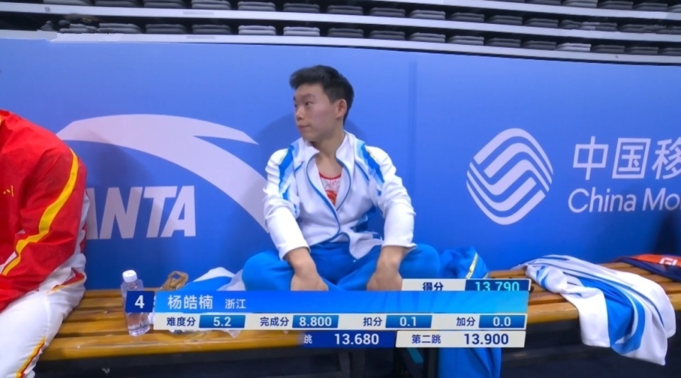 浙江选手杨皓楠计划完成难度5.2的前手翻-前屈两周,第二周有明显屈膝,导致被降成4.8的前团两周,落地深蹲也很明显,得分13.68;笠松720空中姿态不错,向后一大步加一小步并单足出界,得分13.90,平均13.79完赛。