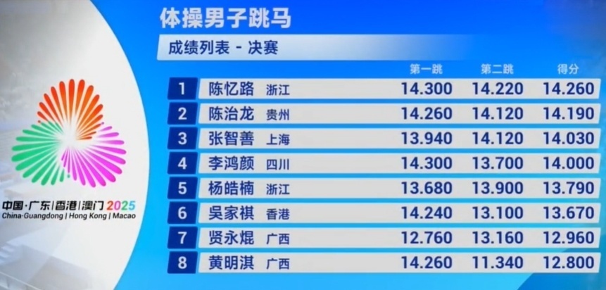 全运会男子跳马:黄明淇无缘三连冠!上届亚军陈忆路技高一筹如愿问鼎