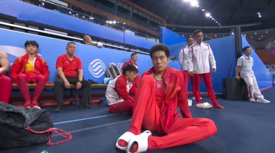 江苏老将孙炜中穿180有个小调整,导致动能减弱,勉强接团身旋,结果掉下...后半段也有个失误,拿到12.30。