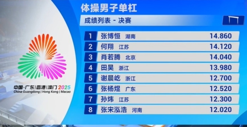 就这样,在团体、全能、双杠都收获银牌之后,张博恒终于在单杠项目上拿到了金牌,成为全运会冠军。何翔为江苏拿下银牌,肖若腾再收一枚铜牌。