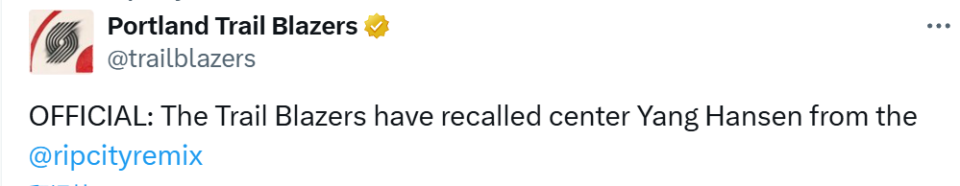 开拓者官宣召回杨瀚森:有望明日出战太阳 G联赛场均14.5分11板2帽