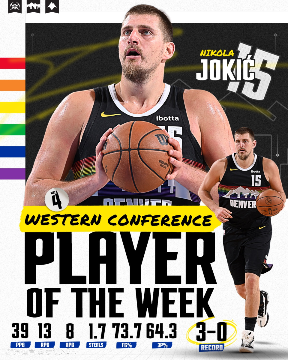 继上一周成为西部周最佳后,本周约基奇蝉联该项荣誉。生涯19次成为周最佳球员,也让约基奇继续在掘金队史上排名第一。过去这一周,约基奇场均贡献39分13篮板8助攻,篮命中率73.7%、三分命中率64.3%,率领掘金打出3胜0负的战绩。这是约基奇职业生涯第二次连续两周获此殊荣(此前为2021年1月26日和2月2日那两周)。