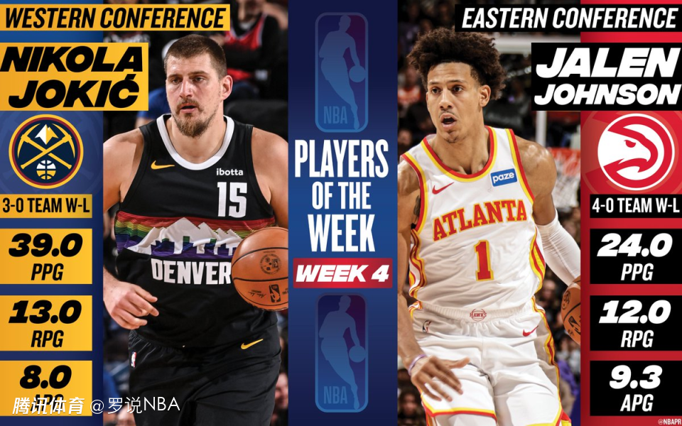 2025-11-18 05:30北京时间11月18日,NBA官方公布了第4周的周最佳球员,掘金球星约基奇和老鹰球星杰伦-约翰逊分别当选。这是约基奇生涯第19次当选周最佳,也是本赛季第2次获此殊荣,连续两周当选。这是杰伦-约翰逊生涯首次成为周最佳球员。库里、东契奇、哈登等球星获得提名。