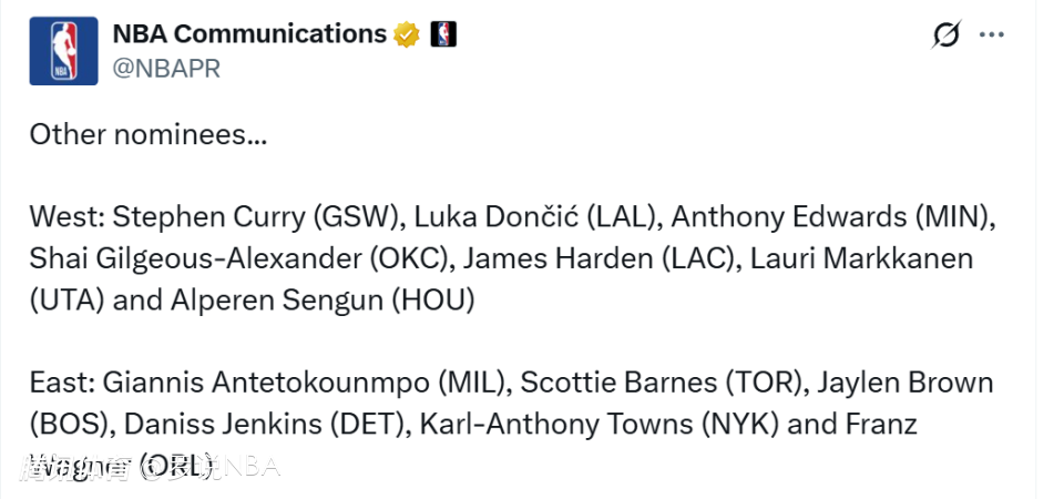 NBA官宣周最佳:约基奇蝉联约翰逊首次当选 库里东契奇哈登获提名