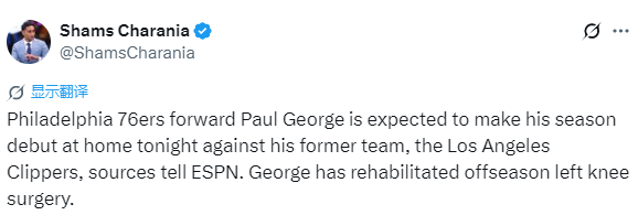 终于回归!Shams:乔治将在76人对阵快船时完成本赛季首秀