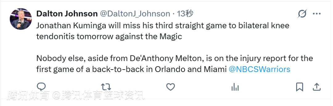 2025-11-18 06:50北京时间11月18日,根据勇士队记Dalton Johnson的报道,库明加因双侧膝盖肌腱炎,将连续缺席第三场比赛,无缘明日对阵魔术队的比赛。