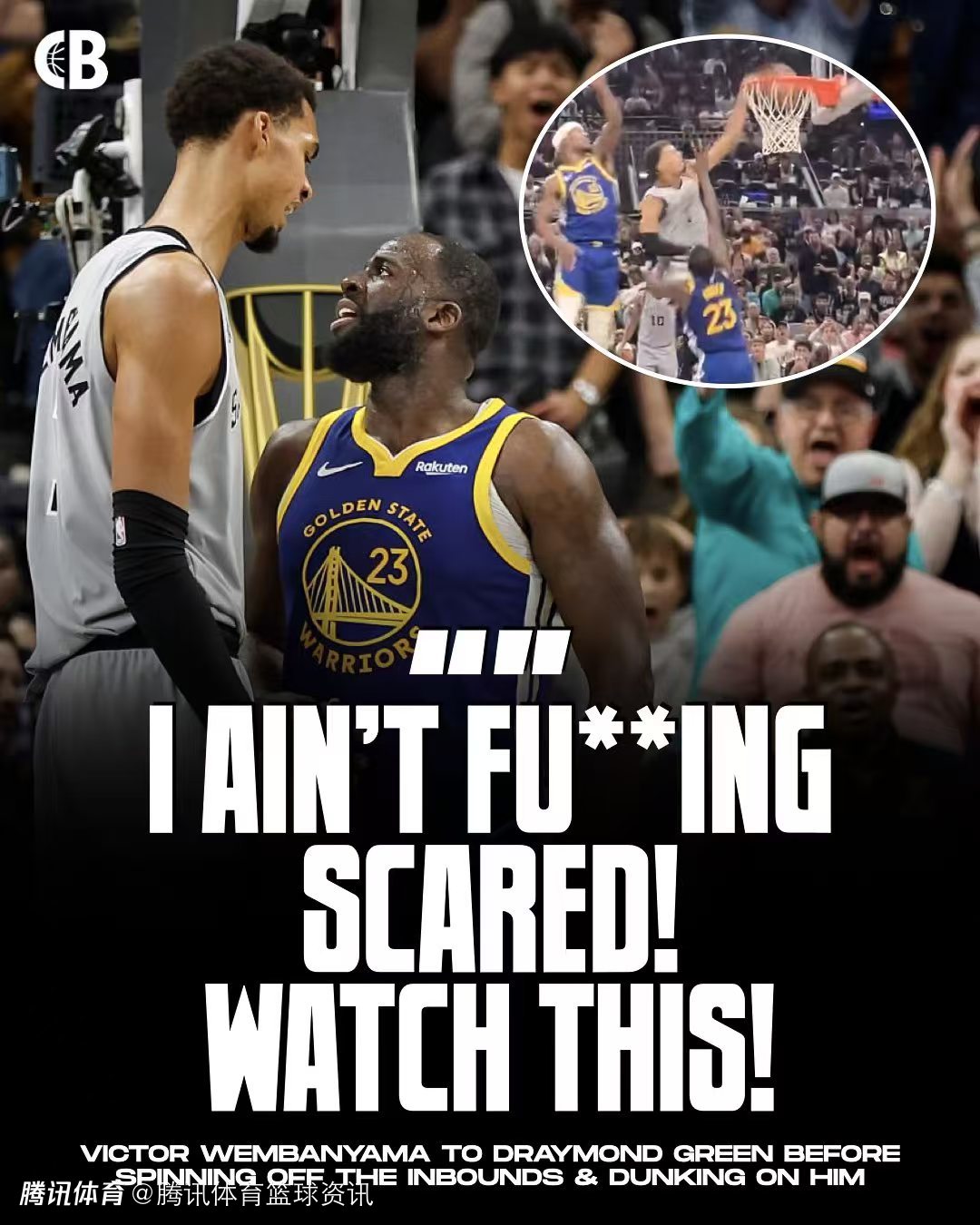 追梦说道:“嘿,兄弟,看好了。我之前跟那个大个子文班亚马有过一次精彩对决,我俩那段交锋至今印象深刻。想必大家都在聊那次扣篮,但扣篮之前,是我先完成了一次封盖。盖掉那球的时候,我盯着他,眼神特别霸气,那感觉就像在说‘怎么样’。结果他来了句‘哦?就这?你也太矮了吧’。我当时就往前走了两步,心里默念‘你等着瞧’,嘴上回他‘你格局太小了’。他一脸懵:‘什么?我格局小?’我接着怼:‘你就是怕我了’。他更惊讶了:‘怕你?开玩笑呢?’”