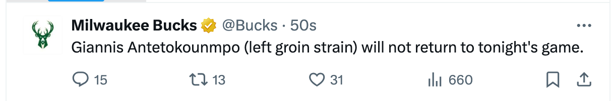 雄鹿官方:字母哥遭遇左腹股沟拉伤 本场比赛不会回归