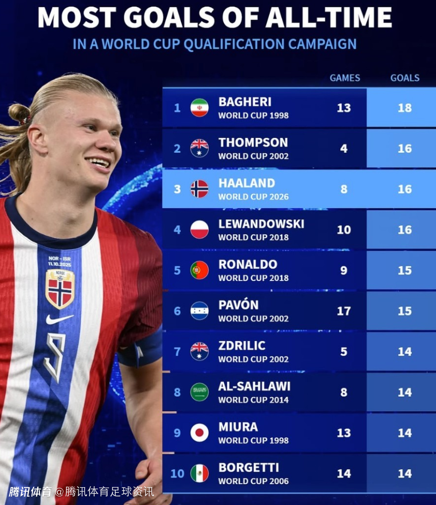 2025-11-18 11:30北京时间11月18日,在挪威以8战全胜的成绩力压意大利晋级美加墨世界杯之后,德转公布了单届世界杯预选赛历史进球榜。