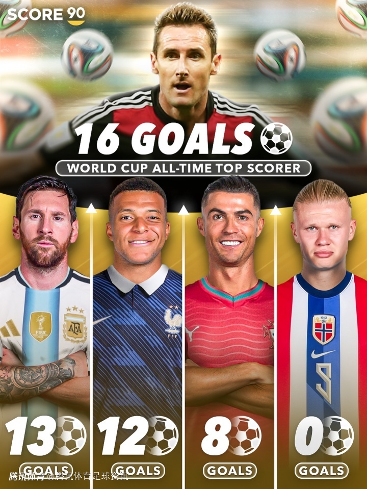 目前的世界杯历史射手王是德国名将克洛泽,他在4届世界杯中出场24次,攻入16球,超过了巴西传奇罗纳尔多的15球。现役球员方面,梅西已打进13球,姆巴佩则有12球,两人都具备在明年世界杯上超越克洛泽的可能。