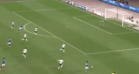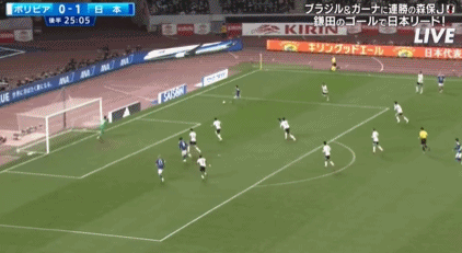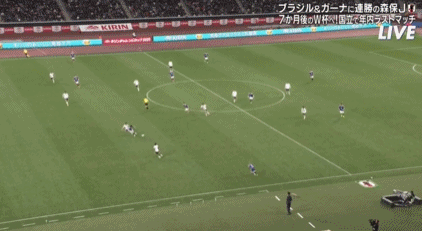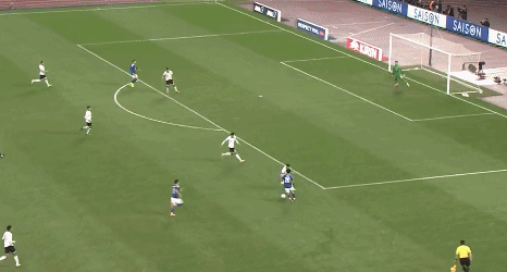 日本从后场连续传递组织进攻,久保健英直传,菅原由势传中,小川航基头球攻门被门将扑出,皮球击中横梁。