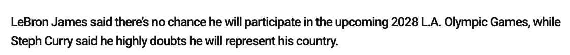 巴黎奥运成最后一舞?詹姆斯明确退出28年洛杉矶奥运 库里参赛存疑