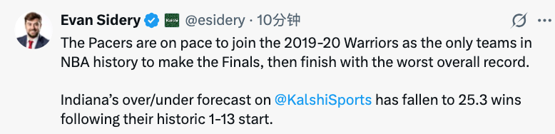 在打出1胜13负开局后,KalshiSports平台对印第安纳步行者队新赛季的胜负预测,已降至25.3胜场。