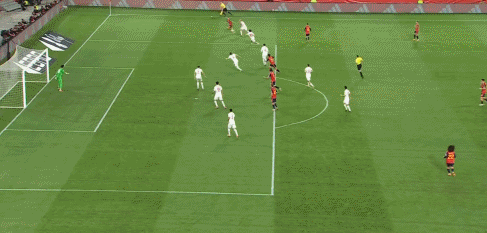 第30分钟,奥尔莫禁区前沿脚后跟停球摆脱防守,最后抽射被门将托出底线。
