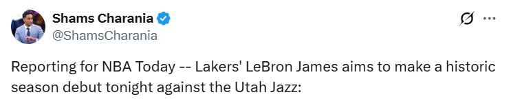 “消息人士告诉我,勒布朗-詹姆斯正计划并希望今晚在主场对阵犹他爵士队的比赛中完成赛季首秀。他会在比赛日按惯例进行赛前准备,包括赛前小憩、场上训练,之后再做最终决定。所以在开启创纪录的第23个NBA赛季前,他仍需完成一些流程,但据我了解,勒布朗-詹姆斯渴望重返赛场,基本上就是今天。”