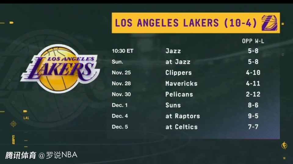 湖人近期将开启一段“甜蜜赛程”,连续5场的对手胜率不超过50%,依次是爵士(两场)、快船、独行侠和鹈鹕。随后他们将连续对阵当前8胜6负的太阳、9胜5负的猛龙和7胜7负的凯尔特人。