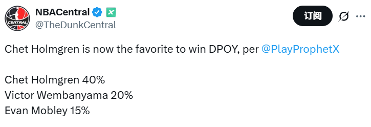 这位21岁的前状元秀本赛季场均贡献26.2分,同时以场均10.9个篮板和3.6次盖帽领跑全联盟。上赛季,他因肩部出现血凝块,缺席了赛季最后30场比赛,也因此无缘当选最佳防守球员(DPOY)。如今,本赛季开季不久,他又遭遇伤病问题,他会不会再次因出场次数不足而无缘DPOY?至少目前他的获奖概率(20%)已经降至第二,排在首位的是雷霆的霍姆格伦(40%),第三是莫布利(15%)。