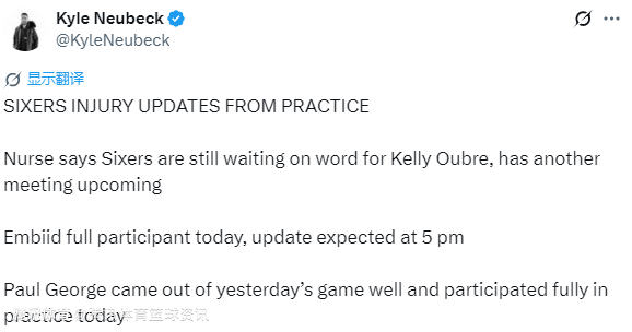 主教练纳斯在接受采访时表示,球队仍在等待乌布雷的最新情况,后续将安排另一场会面进行伤情评估。恩比德今日全程参与训练,预计下午5点公布进一步更新伤情进展。保罗-乔治在昨日打完比赛后状态良好,今日也全程参加了训练。