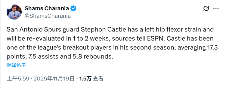 2025-11-19 06:20北京时间11月19日,据名记Shams报道,马刺队后卫斯蒂芬-卡斯尔左髋屈肌拉伤,将于1至2周后接受复查。