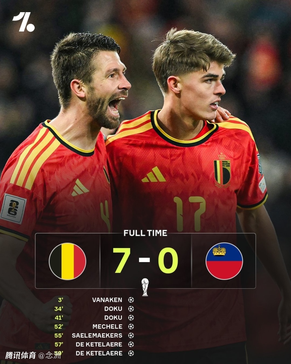世预赛欧洲区小组赛J组第10轮,比利时主场7-0列支敦士登,小组第一直通世界杯,列支敦士登0分垫底。瓦纳肯先拔头筹,多库双响。梅切勒、萨勒马科尔斯破门,德凯特拉雷梅开二度。