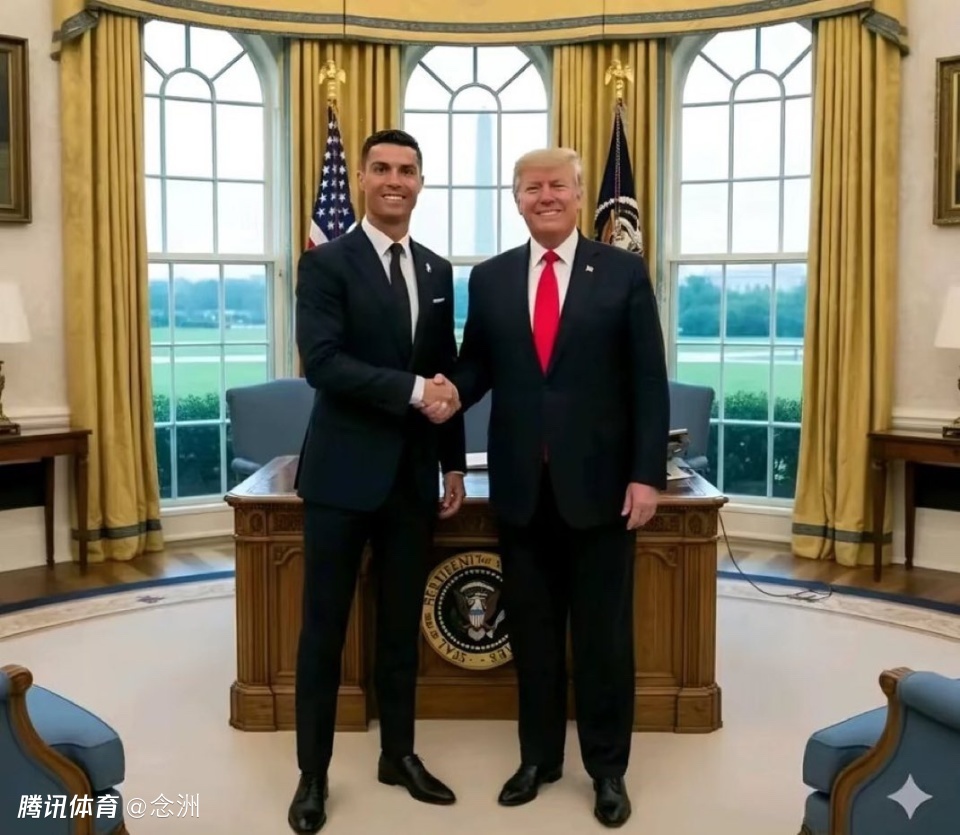 在这张照片里,C罗和特朗普都是西装革履,在著名的白宫椭圆形办公室里会面,并且亲切握手与合影。但是,这张图不是真的!