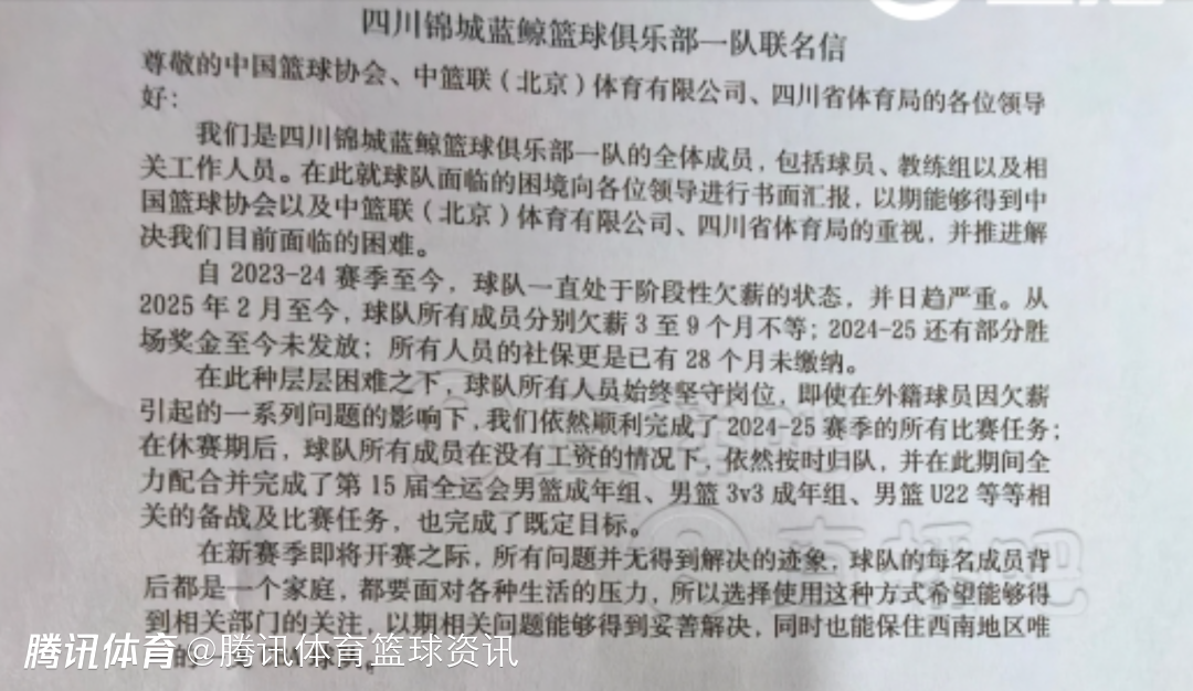 社保28个月未交!四川男篮全体成员发联名信 请求解决欠薪问题