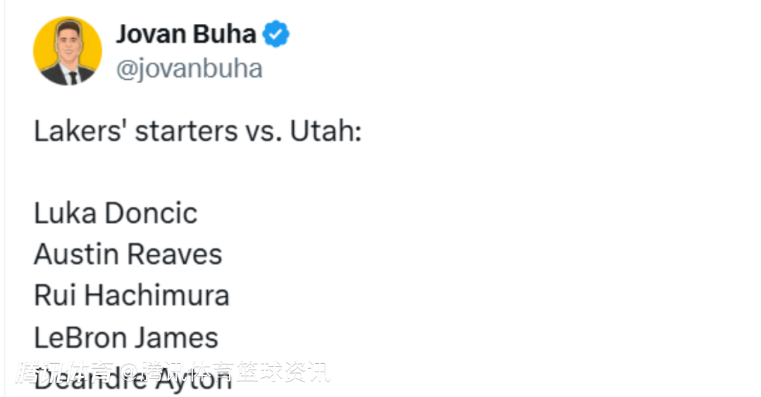 湖人对阵爵士首发阵容出炉:詹姆斯回归 领衔东契奇、里夫斯