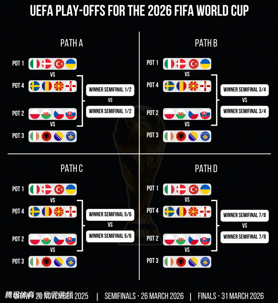 第3档的爱尔兰、阿尔巴尼亚、波黑和科索沃;第4档的瑞典(欧国联直通)、罗马尼亚(欧国联直通)、北马其顿(欧国联直通)和北爱尔兰(欧国联直通)。