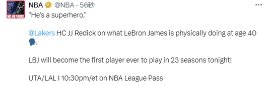 在谈到詹姆斯征战23个赛季的表现时,雷迪克表示:“我只能说说我的亲身感受。你知道,对于我们这些曾经和詹姆斯并肩作战的人,或是看着他的比赛长大的球员来说,他就像个超级英雄。他在赛场上的成就,真的没几个人能做到。”